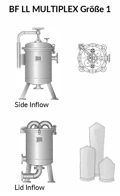 - Filtratzufluss: seitlich (side inflow) oder über den Deckel (lid inflow)